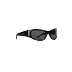 Wrap-around sunglasses in black bio-acetate with black lenses, silver toned hardware and logo.